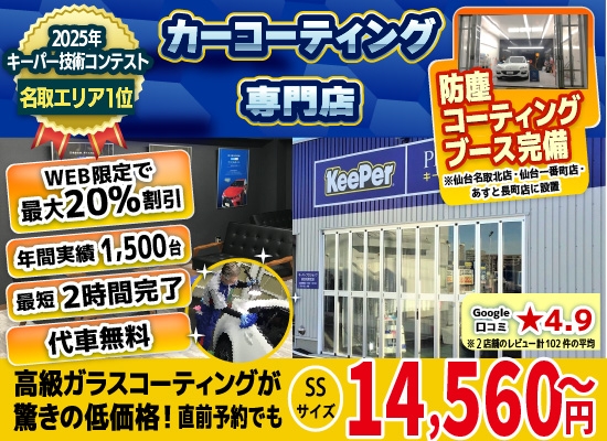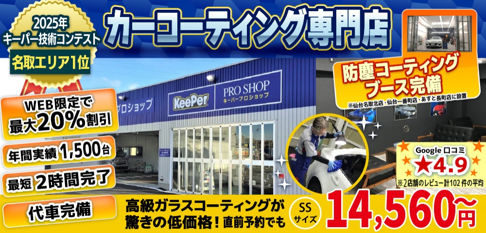 キーパー仙台一番町店・キーパー仙台名取北店・キーパーあすと長町店は、仙台市若林区・泉区・青葉区・太白区・宮城野区、名取市・塩竈市・岩沼市・多賀城市・宮城郡(利府町・七ヶ浜町・松島町)・富谷市のカーコーティング専門店として、日本ダントツのカーコーティングブランド、キーパープロショップとして認定を受けております!