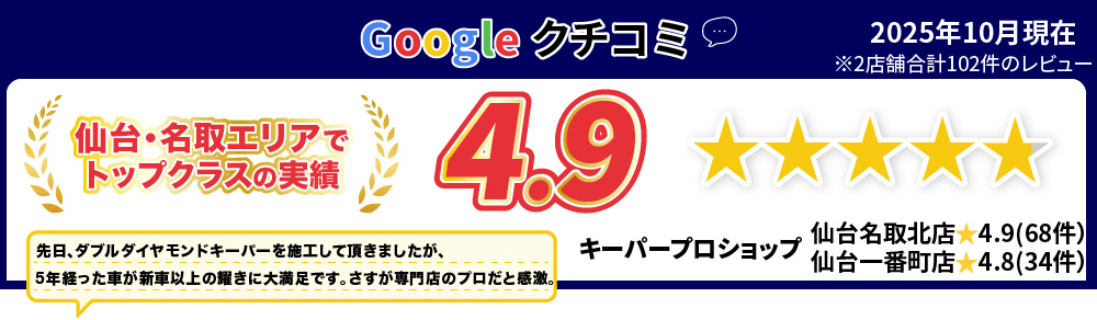 ・先日、ダブルダイヤモンドキーパーを施工して頂きましたが、5年経った車が新車以上の耀きに大満足です。さすが専門店のプロだと感激。スタッフの対応も親切、丁寧で良かったです。キーパー検討の方に是非オススメします。(仙台名取北店)