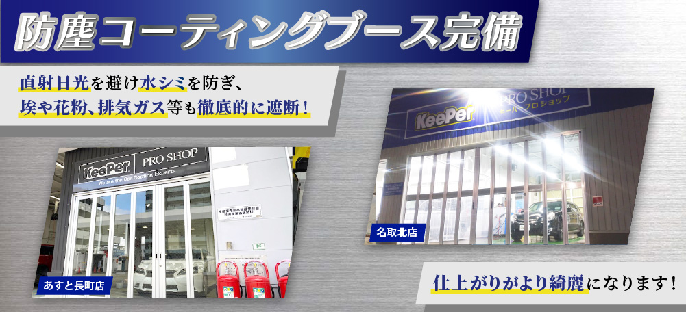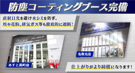 キーパー仙台名取北・キーパーあすと長町店・キーパー仙台ニュー泉店は、全店専用の防塵コーティングブースを完備しており、細かい埃や日光を遮断した環境下で作業を実施いたします!