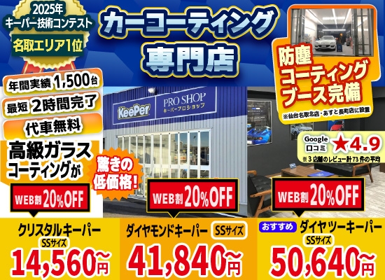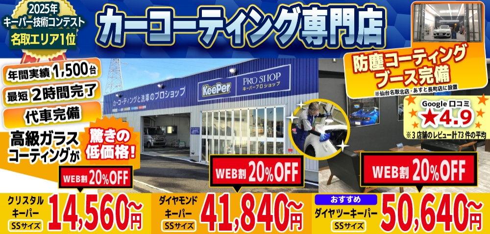 キーパー仙台名取北店・キーパーあすと長町店・キーパー仙台ニュー泉店は、仙台市若林区・泉区・青葉区・太白区・宮城野区、名取市・塩竈市・岩沼市・多賀城市・宮城郡(利府町・七ヶ浜町・松島町)・富谷市のカーコーティング専門店として、日本ダントツのカーコーティングブランド、キーパープロショップとして認定を受けております!